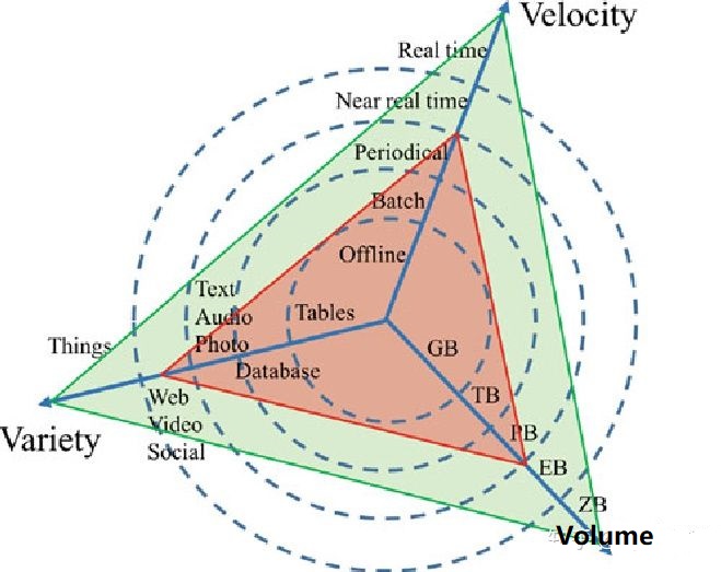 大數據的特點是3V。Velocity(速度)、Variety(多樣)、Volume(容量)