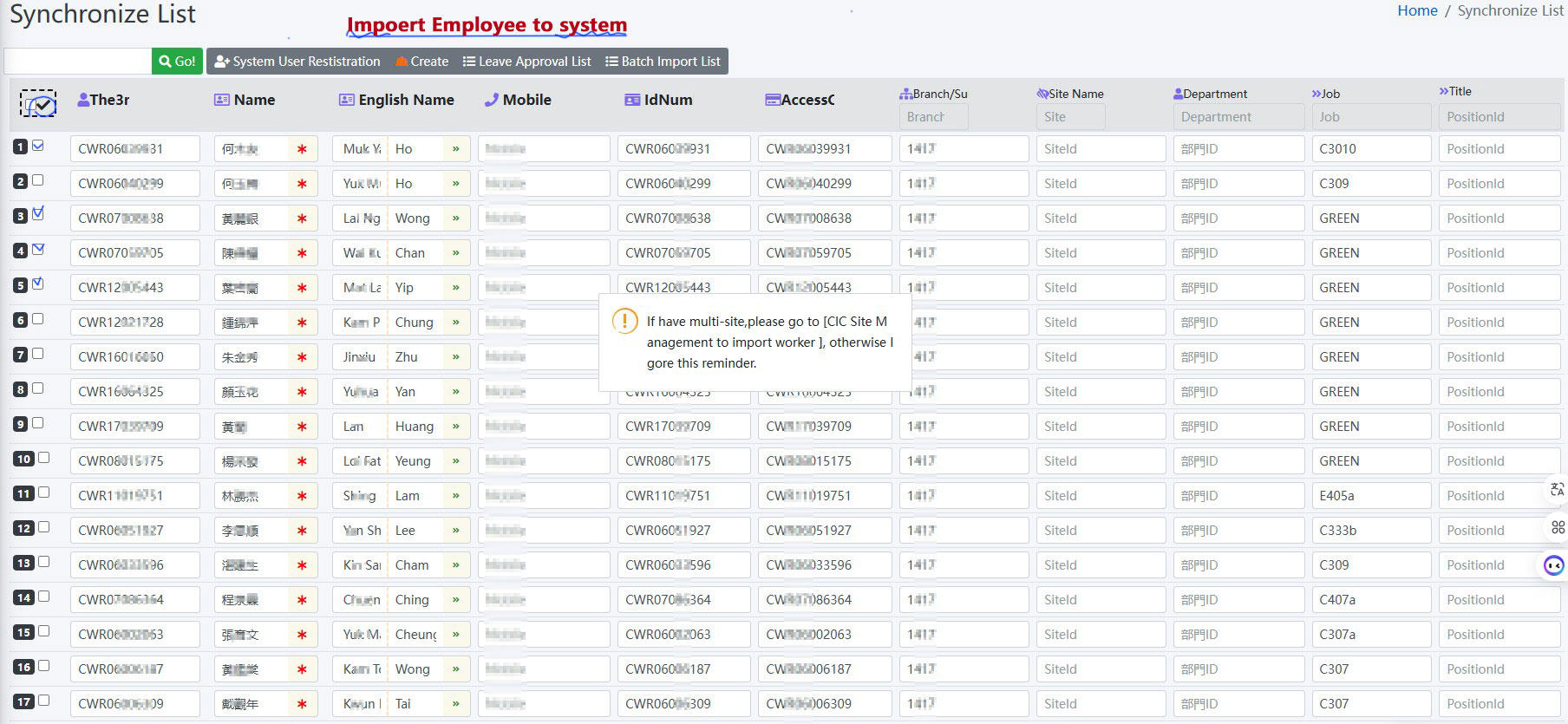 第二步:成功導入考勤人員后,需要進入響應編輯界面進行相關操作,并選擇對應需要存入檔案的,提交后會提示是否成功存檔。提示成功的,才會正式成為系統考勤人員。