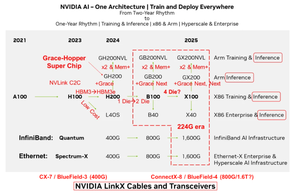 本文嘗試從第一性原理出發,對Nvidia的AI芯片發展路線進行了深入分析和解讀,并對未來的B100和X100芯片架構進行了推演預測。并且,希望通過這種推演提取出未來AI計算系統對互聯技術的新需求。