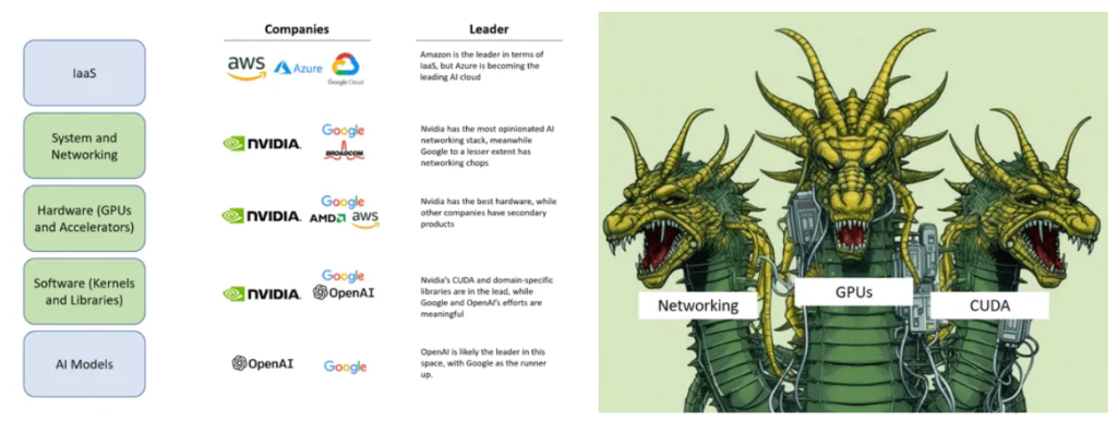 從業務視角看,Nvidia在系統和網絡、硬件、軟件三個方面占據了主導地位 [6]。系統和網絡、硬件、軟件這三個方面是人工智能價值鏈中許多大型參與者無法有效或快速復制的重要部分,這意味著Nvidia在整個生態系統中占據著主導地位。要擊敗Nvidia就像攻擊一個多頭蛇怪。必須同時切斷所有三個頭才有可能有機會,因為它的每個“頭”都已經是各自領域的領導者,并且Nvidia正在努力改進和擴大其護城河。在一批人工智能硬件挑戰者的失敗中,可以看到,他們都提供了一種與Nvidia GPU相當或略好的硬件,但未能提供支持該硬件的軟件生態和解決可擴展問題的方案。而Nvidia成功地做到了這一切,并成功抵擋住了一次沖擊。這就是為什么Nvidia的戰略像是一個三頭水蛇怪,后來者必須同時擊敗他們在系統和網絡、硬件以及軟件方面的技術和生態護城河。目前,進入Nvidia平臺似乎能夠占據先機。OpenAI、微軟和Nvidia顯然處于領先地位。盡管Google和Amazon也在努力建立自己的生態系統,但Nvidia提供了更完整的硬件、軟件和系統解決方案,使其成為最具吸引力的選擇。要贏得先機,就必須進入其硬件、軟件和系統級業務生態。然而,這也意味著進一步被鎖定,未來更難撼動其地位。從Google和Amazon等公司的角度來看,如果不選擇接入Nvidia的生態系統,可能會失去先機;而如果選擇接入,則可能意味著失去未來。