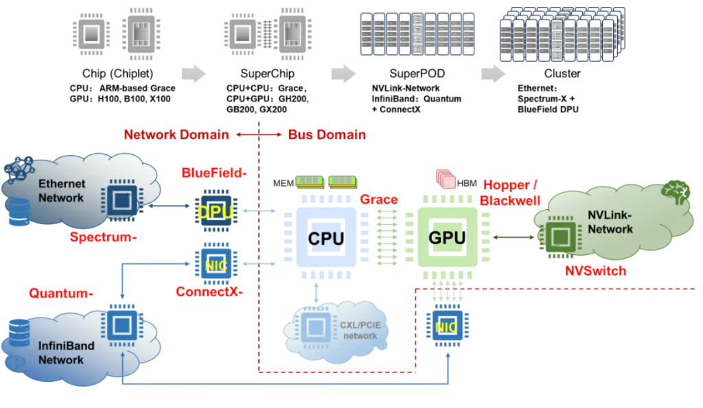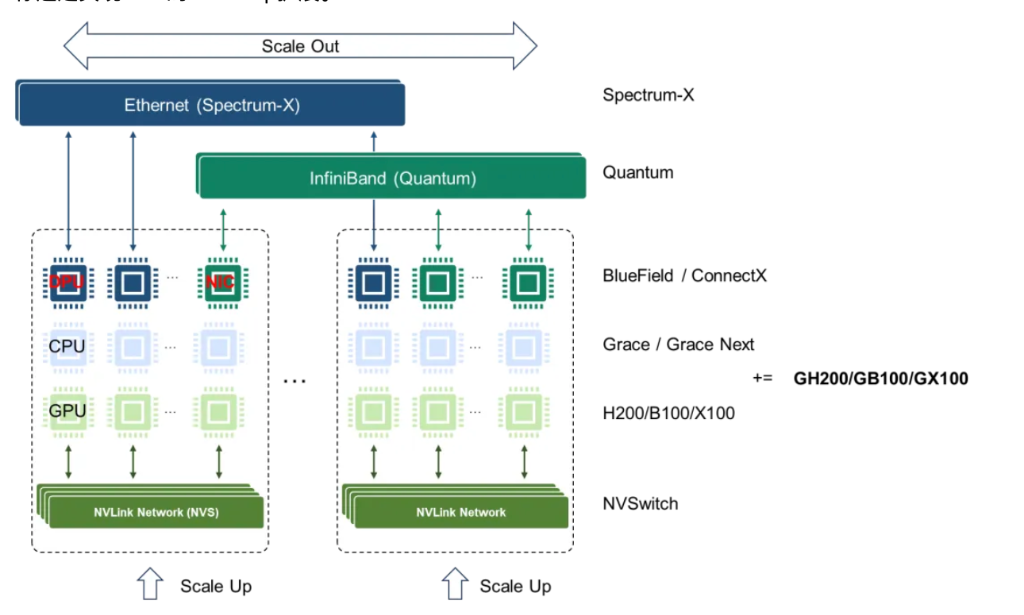 基于B100雙Die架構,采用雙Socket板級3D擴展可以實現與X100同等的算力。類似的方法也可以應用到X100中進一步擴展算力。板級擴展可以降低對工程工藝的要求,以較低的成本實現算力擴展。雖然基于人們對于先進封裝的Chiplet芯粒架構充滿了期待,但是其演進速度顯然無法滿足AI計算系統“三年三個數量級”的增長需求 [33]。在AI計算領域基于先進封裝Die間互聯Chiplet芯粒架構,很可能因為無法滿足AI計算領域快速增長的需求而面臨“二世而亡”的窘境,業界需要重新尋找旨在提升AI算力的新技術路徑,比如SuperChip超級芯片和SuperPOD超節點。因此,類似于NVLink C2C的低時延、高可靠、高密度的芯片間互聯技術在未來AI計算芯片的Scale Up算力擴展中將起到至關重要的作用;面向AI集群Scale Out算力擴展的互聯技術也同等重要。這兩種互聯技術,前者是AI計算芯片算力擴展的基礎,而后者是AI計算集群算力擴展的基礎。