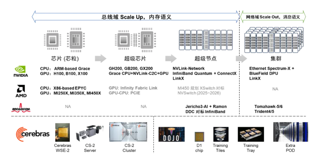 Nvidia在AI集群競爭態勢中展現出了全面布局,涵蓋了計算(芯片、超級芯片)和網絡(超節點、集群)領域。在計算芯片方面,Nvidia擁有CPU、GPU、CPU-CPU/CPU-GPU SuperChip等全面的布局;在超節點網絡層面,Nvidia提供了NVLink和InfiniBand兩種定制化網絡選項;在集群網絡方面,Nvidia有基于Ethernet的交換芯片和DPU芯片布局。AMD緊隨其后,更專注于CPU和GPU計算芯片,并采用基于先進封裝的Chiplet芯粒技術。與Nvidia不同的是,AMD當前沒有超級芯片的概念,而是采用了先進封裝將CPU和GPU Die合封在一起。AMD使用私有的Infinity Fabric Link內存一致接口進行GPU、CPU、GPU和CPU間的互聯,而GPU和CPU之間的互聯仍然保留傳統的PCIE連接方式。此外,AMD計劃推出XSwitch交換芯片,下一代MI450加速器將利用新的互連結構,其目的顯然是與Nvidia的NVSwitch競爭 [15]。BRCM則專注于網絡領域,在超節點網絡有對標InfiniBand的Jericho3-AI Ramon的DDC方案;在集群網絡領域有基于Ethernet的Tomahawk系列和Trident系列交換芯片。近期BRCM推出其新的軟件可編程交換Trident 5-X12集成了NetGNT神經網絡引擎實時識別網絡流量信息,并調用擁塞控制技術來避免網絡性能下降,提高網絡效率和性能 [16]。Cerebras/Telsa Dojo則“劍走偏鋒”,走依賴“晶圓級先進封裝”的深度定制硬件路線。