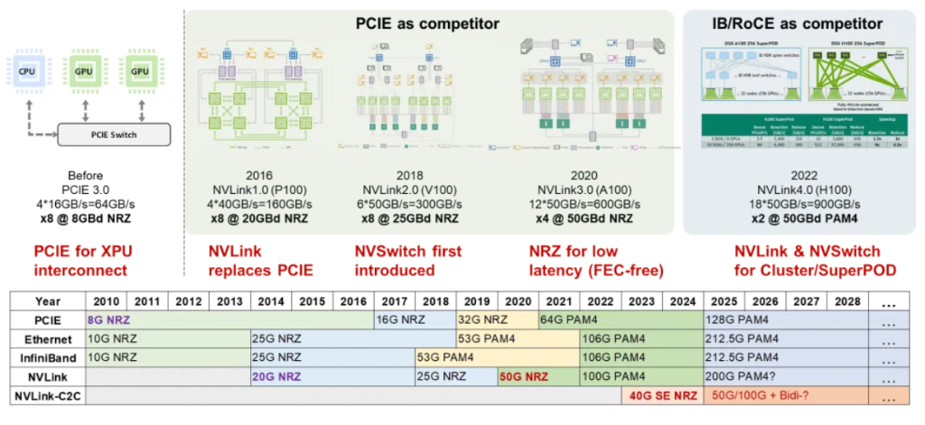 互聯技術的演進是一個漸進的過程,其基本技術要素如帶寬、調制和編碼等都遵循著其內在的發展規律。這些物理規律相對穩定,通過將這些技術進行組合并結合當前工程工藝的發展趨勢以及需求,就可以大致描繪和預測出互聯技術的發展方向。在這里不深入探討晦澀難懂的互聯技術本身的發展,而是從宏觀技術邏輯和外在可觀察的指標兩個角度出發,探討NVLink和NVLink C2C的歷史演進,并對其未來發展進行預測。