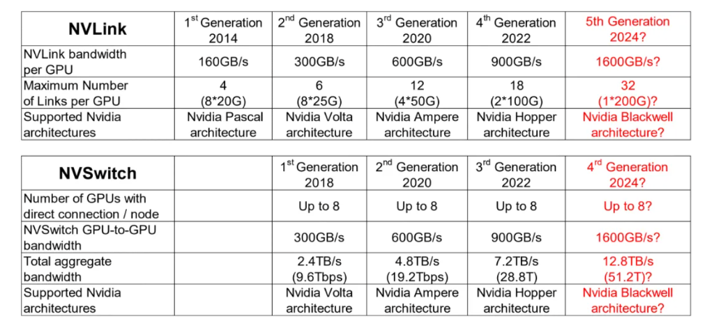 從NVLink和NVSwitch的演進來看,每一代速率會是上一代的1.5到2倍。下一代NVLink5.0大概率會采用200G每通道,每個GPU能夠出的NVLink接口數量從18個增加到32個,甚至更高。而NVSwitch4.0在端口速率達到200G以外,交換芯片的端口數量可能在NVSwitch3.0交換芯片64端口的基礎上翻2倍甚至4倍,總交換容量從12.8T到25.6T甚至51.2T [30]。