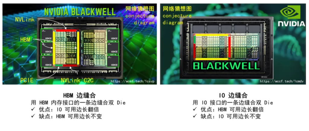 H100不具備旋轉對對稱性,而雙Die的B100仍需支持 GH200 SuperChip 超級芯片,因此B100可能由兩顆異構 Die組成。按照不同的長寬比采用“IO邊縫合的方式”B100 的面積達到3.3到3.9倍的Reticle面積,小于當前TSMC CoWoS先進封裝能夠提供的4倍Reticle面積的能力極限。計算 Die 之間互聯可以復用 NVLink C2C 互聯技術,既利用 NVLink C2C出封裝的連接能力覆蓋Die間互聯的場景。