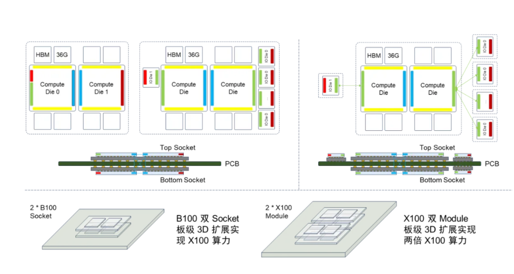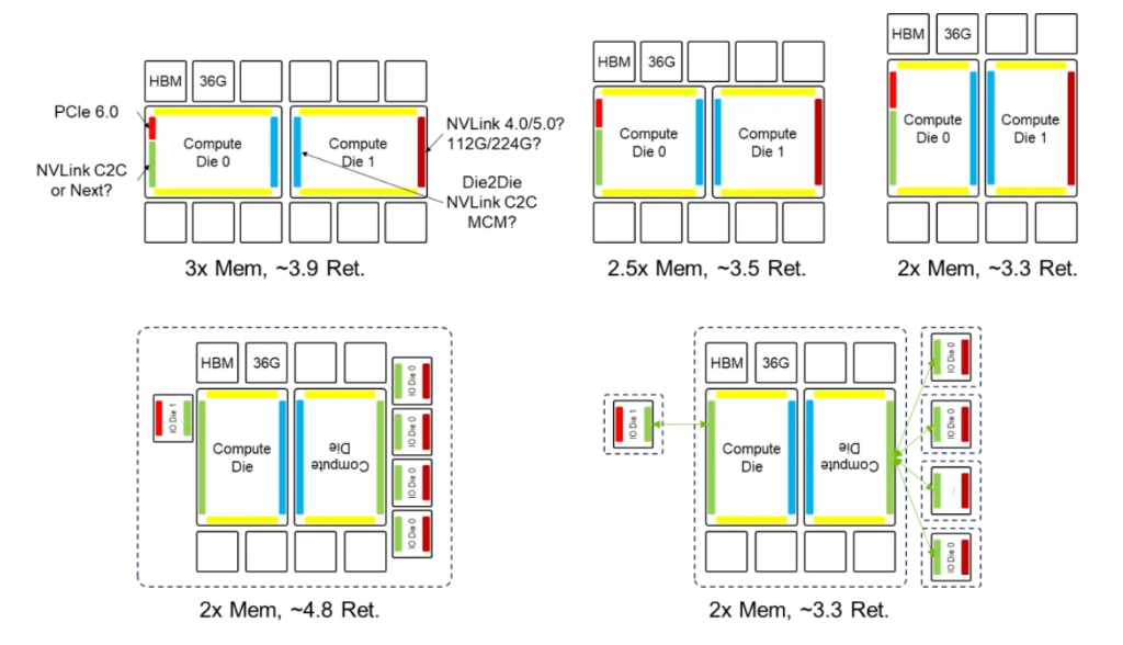 在滿足2025年的工程約束的前提下,X100也可以采用SuperChip超級芯片架構在B100雙Die架構的基礎上進行平面擴展。在這種情況下,Nvidia X100 也有“異構 Die 合封”,“同構計算 Die 與 IO Die 合封”,“計算 Die 與 IO Die 分別封裝”三種架構選項。如果采用封裝間互聯的超級芯片的擴展方式,先進封裝的基板面積約束將不再會是瓶頸,此時只需要增強NVLink C2C的驅動能力。