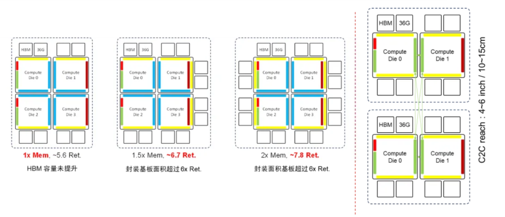 Nvidia X100如果采用單Socket封裝四Die架構,封裝基板面積將超過6倍Reticle面積,這將超出2025年的先進封裝路標的目標。而如果采用雙Socket封裝架構,則需要使用10~15cm的C2C互聯技術來實現跨封裝的計算 Die間的互聯,這可能需要對當前NVLink C2C的驅動能力進一步增強。