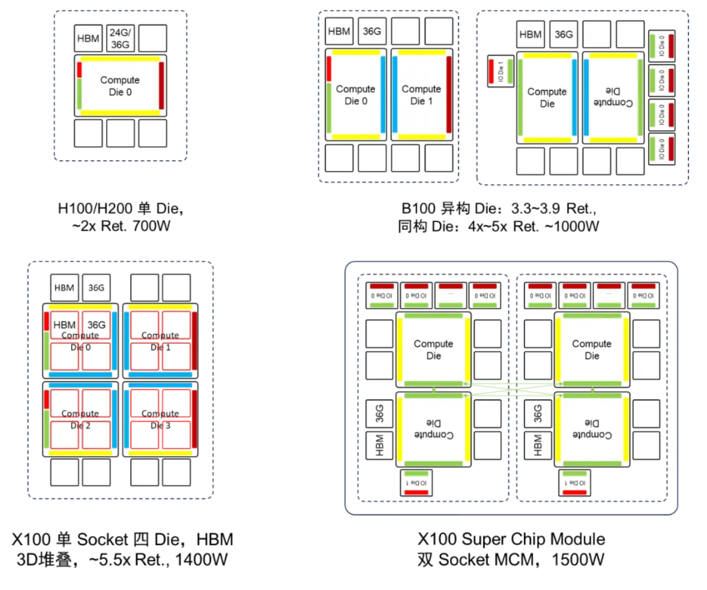 3. 如果X100采用單Socket封裝,四個異構Die合封裝的方式,需要在計算Die上堆疊HBM,同時需要先進封裝的基板達到6倍Reticle面積。但是,如果采用SuperChip超級芯片的方式組成雙Socket封裝模組,可以避免計算Die上堆疊HBM,并放松對先進封裝基板面積的要求,此時需要對NVLink C2C的驅動能力做增強。